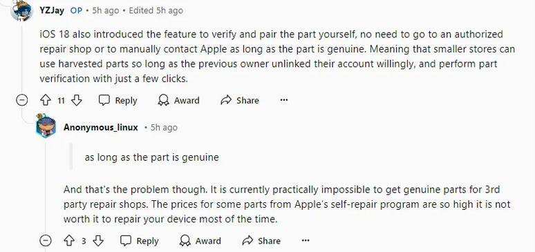 For third-party repair shops, they can no longer offer cost-effective services using alternative components, forcing users to rely on more expensive authorized Apple repairs. This iOS 18 locking also makes the resale and recycling of iPhones more complicated, reducing the potential for the reuse of locked parts and affecting the value of the second-hand market.